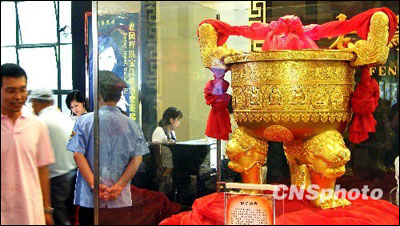 24日,在上海举行的“中华老字号博览会”上,一口硕大的黄金鼎成为焦点。这口名为“静安佛鼎”的鼎高88厘米,耗用了108公斤黄金,由老凤祥的中国工艺美术大师张心一领衔众多首席技师、一级技师制作,完工后将被安放在静安寺宝塔中。