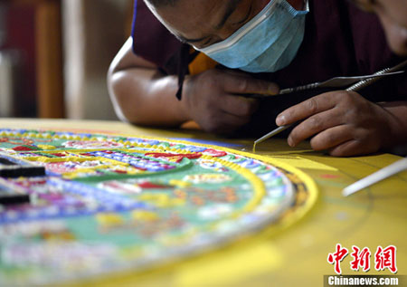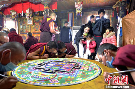 图为公德林寺僧人正在绘制坛城。(摄影:李林)