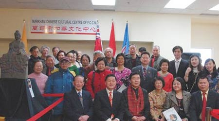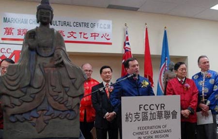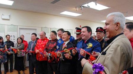 加拿大联邦公民、移民及多元文化部长康尼(Jason Kenney)出席了开幕式,并与FCCM主席吴建忠(Dr.Ken Ng)共同致了开幕词,Kenney代表总理Stephen Harper及加拿大政府对此次展出及FCCM新中心的开幕表达了祝贺及赞赏,并亲自给寒山寺颁发“加拿大多元文化交流金枫叶奖”,给著名雕塑艺术家陈津生颁发“加拿大艺术金枫叶奖”,同时给此次活动的主要发起及主办人:吴崔怡敏(Emily Ng),余琼(Christina Yu), 唐一均(Tony Tang)授奖。