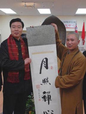 中国驻多伦多总领事房利出席了开幕式,赞赏之余他亲自扶正了佛雕像前的吉祥八宝,般若讲堂住持照续法师代表寒山寺赠送了秋爽大和尚的亲笔书法“月照禅心”给总领事。湛山精舍九十岁高龄的开山宗长性空长老与现任住持达义法师等为展会内的佛像开光,会场佛光普照,梵音绕梁。