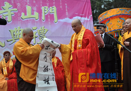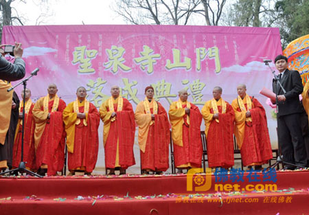 果光法师在庆典上代表诸山长老致辞,并为圣泉寺山门落成暨四大天王像开光庆典撰书贺联一副:“圣土有缘培正果;泉流无阻向真如。”赠送圣泉寺。庆典活动结束后,来宾们在圣泉寺新落成的山门前合影留念。