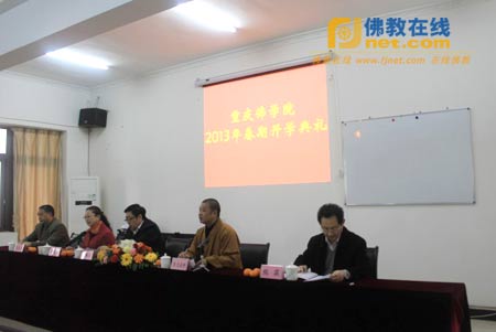2013年3月1日上午,重庆佛学院2013年春期开学典礼在学院四楼多媒体教室举行,重庆市民宗委副主任喻柏炎,市民宗委宗教三处处长何晓艳、调研员史金山,佛学院教育长朗光法师及全院师僧出席了典礼。会议在通报学院近期有关工作的基础上,对本学期各项工作尤其是新生招录和毕业班工作进行了安排部署。典礼由朗光法师主持。