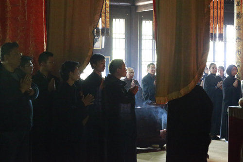 义工们恭敬等候瞻仰