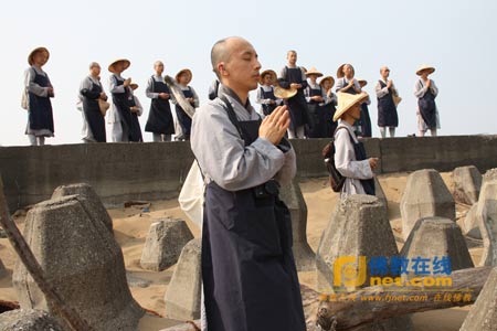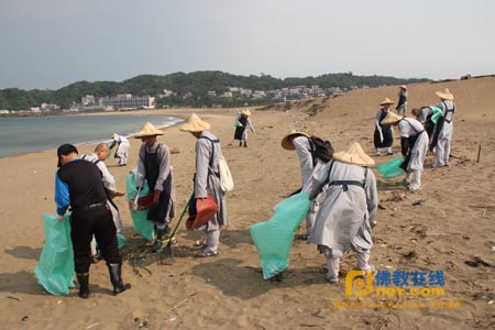将岸边垃圾一片片拾起,如同将心中烦恼一件件放下。在僧袍外套著工作服的法鼓山僧伽大学30多位学僧、师长及热心的民众,于2013年3月20日下午2时顶着烈阳,前往近两公里长的金山磺溪口海滩,以实际的净滩行动,展现对于大地孕育众生的感念。