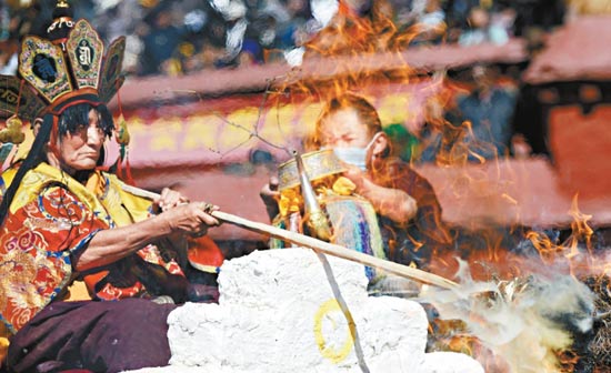 2013年3月26日,西藏拉萨市甘丹寺举行“火供”宗教仪轨。“火供”是藏传佛教密宗里的一种特殊供养仪轨,是用焚烧贡品、谷物、树枝、咒符等供养神灵的祭祀方式之一,通常用来祈求祥和平安,也用来超度亡灵、降妖伏魔。