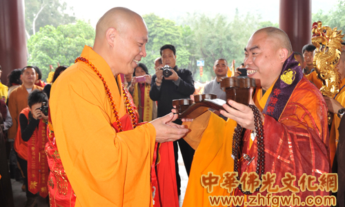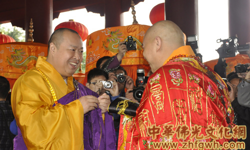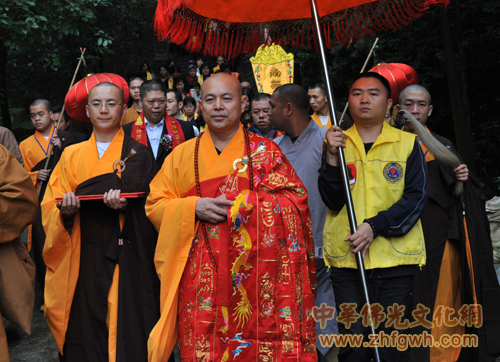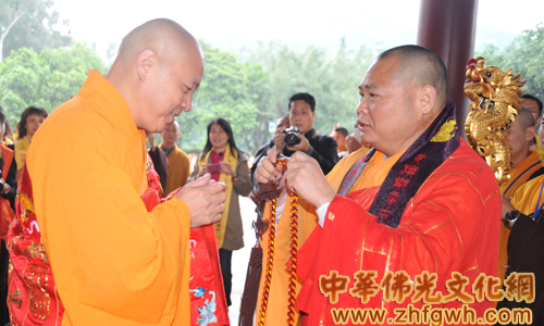 东莞黄旗观音古寺自度法师升座庆典 湖南省佛教协会副会长、南岳佛教协会会长大岳法师搭祖衣 广东省佛教协会常务副会长光明法师授佛珠 广东省佛教协会副会长、国恩寺方丈如禅法师授如意 广东省佛教协会副会长、云门寺方丈明向法师授佛尘 中国佛教协会副会长、深圳弘法寺方丈印顺法师为自度法师送位 自度法师登方丈座 说法演教 广东省民宗委宗教处陈洁施处长在升座庆典上发言