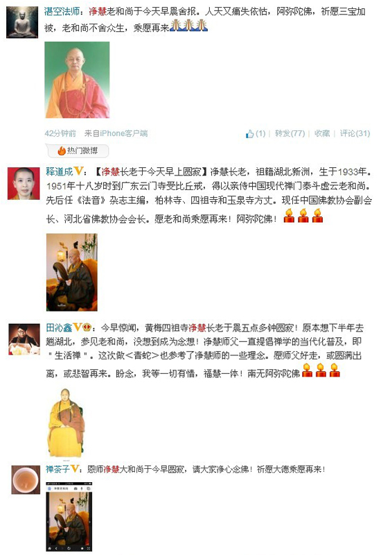 中华佛光文化网广东讯 中国佛教协会副会长、河北省佛教协会会长、湖北四祖寺方丈、当代佛教界德高望重的净慧长老,于2013年4月20日凌晨八时许在湖北武汉安详示寂,世寿八十岁。天地含悲,祗树凋落。
