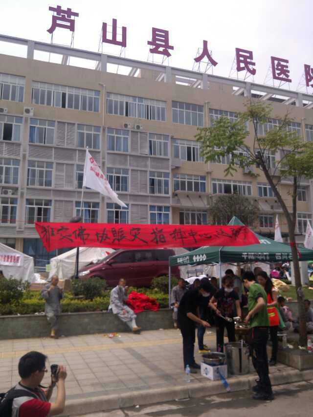 雅安市佛教协会救灾指挥中心在震中芦山县医院门口设立,智灯大和尚及佛协法师在现场指挥!第一阶段重点施粥!需要米,水,煮粥锅及施粥桶!发电机,手机充电排插,柴油,汽油!请已经到达芦山的法师,居士及义工向指挥中心靠拢!