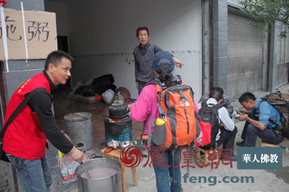 重庆华岩文教基金会抗震救援队在雅安龙门乡施粥(图片来源:凤凰网华人佛教)