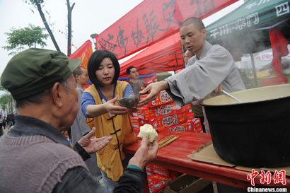 成都文殊院僧人居士在灾区施粥现场(图片来源:中新网)