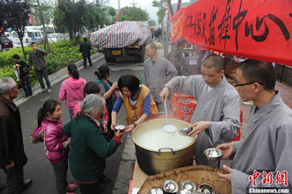 4月22日,来自成都文殊院的僧人在雅安芦山县城,为民众发放免费的热粥。中新社发张浪摄