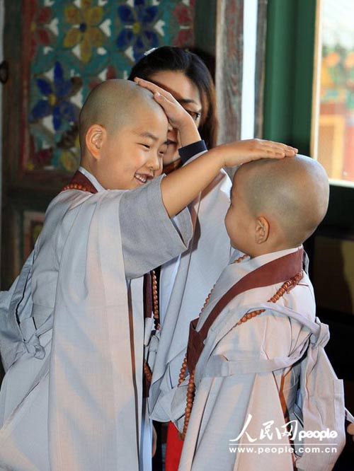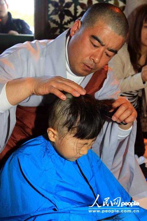 当地时间2013年4月27日,正值佛祖诞辰日,韩国的儿童为短期出家受戒剔去了头发。(图:东方IC )