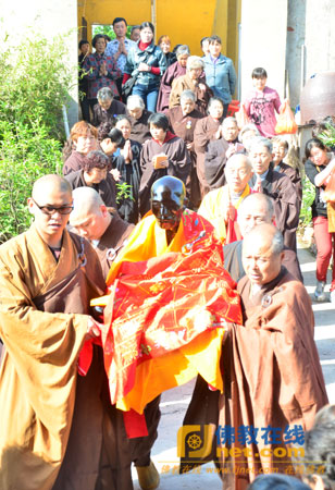 两序大众将慈云长老法身迎请至弥陀宝塔中供奉