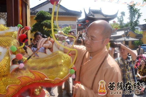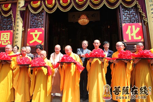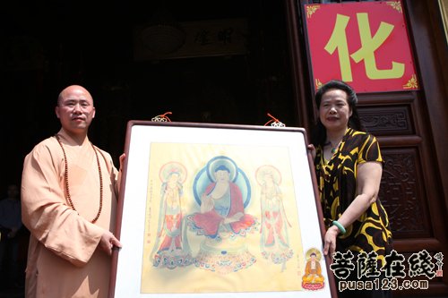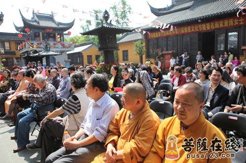 最后,悟端大和尚、费水弟先生、丁锡满先生、程瑜女士、方百川先生、萧博女士、恽甫铭先生、章尚敏先生、陶亚杰先生、刘兆麟先生、袁继先先生、王延林先生、唐菊芳居士、张芸芳女士、杨柏伟先生共同为“观音专题”画展及崇恩文化节开幕剪彩。剪彩仪式后,特邀表演团为西林塔杯第六届崇恩文化节进行了丰富多样的节目表演。赢得了现场阵阵掌声,欢声笑语连绵不断。表演结束后,悟端大和尚和与会人员一同前往圆应塔参观画家萧博女士画展,画展现场不少书画爱好者用相机或摄像机将萧博女士作品拍摄,准备过后再细细品味欣赏。(现场记者:妙静 妙尘 慧悟 慧晨)
