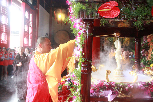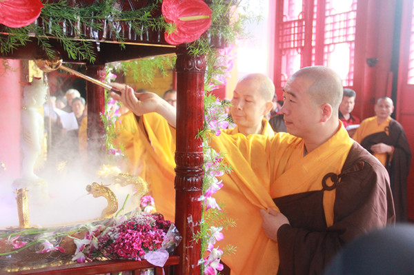 上午8点30分,梵呗敲响,声声吉祥,由隆相大和尚主法的浴佛法会正式开始。隆相大和尚在活动中带领十方信众用香水浴佛。对佛祖进行一次洗浴,浴佛时除纪念佛祖的诞辰外,也有洗涤人心的污秽黑暗、洁净众生的心灵之意。浴佛法会现场有序的进行,庄严无比。