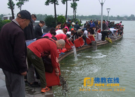 上午8点30分,在兴化寺南门外停放了三辆装满长鱼、甲鱼、泥鳅、黑鱼等鱼种的汽车。果光法师带领四众弟子按放生仪轨举行了放生仪式。随后大客车载着众居士,护送放生车辆,冒着蒙蒙细雨驶向大龙湖放生,使数万生灵回归自然。