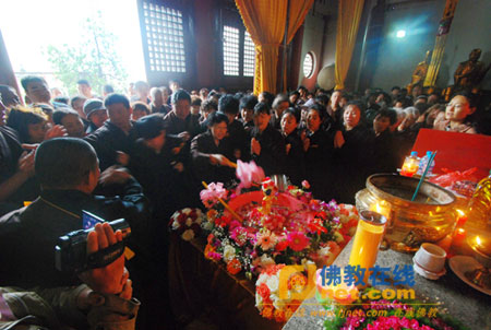 下午14点30分,果光法师在大雄宝殿为百余名信徒传授三皈五戒。三皈就是皈依佛、皈依法、皈依僧。五戒,就是不杀生,不偷盗,不邪淫,不妄语,不饮酒。果光法师开示说,受持了三皈,从今才算是一个真正的佛教信徒;五戒,是学佛必须遵守的基本原则,是佛门弟子应该遵守的戒律。希望新皈依的佛教信士从今彻底改造自己,启发自性,坚持正智正念正行,转迷为悟,反邪归正,反愚为智,反染为净,化愚成智,从此要力求做到恶念不生,恶言不语,恶行不为,提高理智,发菩提心,以佛教的真理,作为自己生命的归宿。