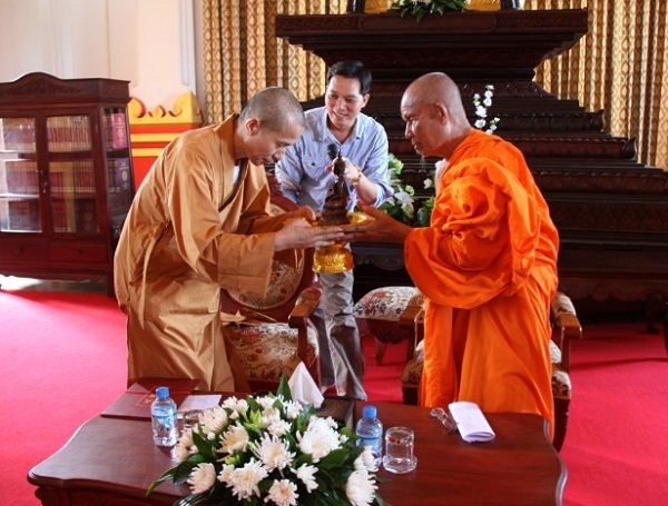 27日上午,在老挝国家佛教委员会隆重举行了《大藏经》捐赠仪式。老挝国家宗教局副局长宋鹏·阿里纳、国家佛教委员会副主席奔玛·辛玛蓬尊者、国家佛学院院长蓬双·乔皮龙尊者出席了捐赠仪式。老挝佛教委员会副主席奔玛·辛玛蓬尊者向常辉法师介绍了老挝佛教的现状,并对中老佛教文化交流予以充分的肯定,并希望加强老挝佛教委员会与河北佛教慈善基金会在慈善领域的更广阔合作。常辉法师随后也介绍了佛教慈善的“无相布施”理念以及本次捐赠《大藏经》的缘起。本次捐赠是老挝佛教界第一次接受并供奉汉传佛教藏经,这也就是在老挝种下了大乘佛教的种子。本次捐赠给老挝佛教界的四套汉传藏经将分别由老挝国家佛教委员会、老挝国家图书馆、老挝国家佛学院、老挝黄鸡香通寺供养。老挝佛教委员会副主席奔玛·辛玛蓬尊者向常辉法师回赠了一尊带有老挝上座部佛教特点的释迦牟尼佛宝像。