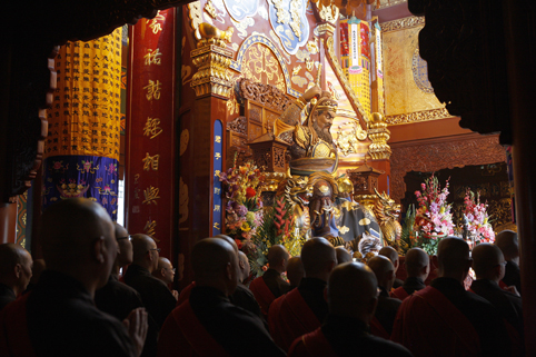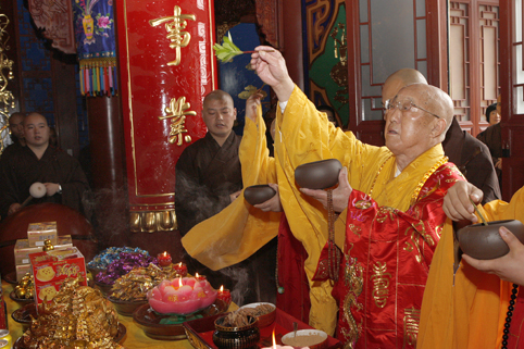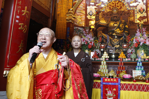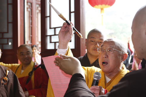 松纯长老红光满面,精神矍铄,声如洪钟。在开光仪式上长老用其独有的天宁梵呗唱诵开光法语,其声和雅、正直、激昂、深情,抑扬顿挫。随着三位主法共诵“开!开!开!”,将法会带入了高潮!护法檀越齐声欢呼,虔诚礼拜,顶礼祝圣,共同祈愿祖国繁荣昌盛、风调雨顺、国泰民安!绍兴人民财星高照、财源广进、共沾财气!
