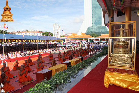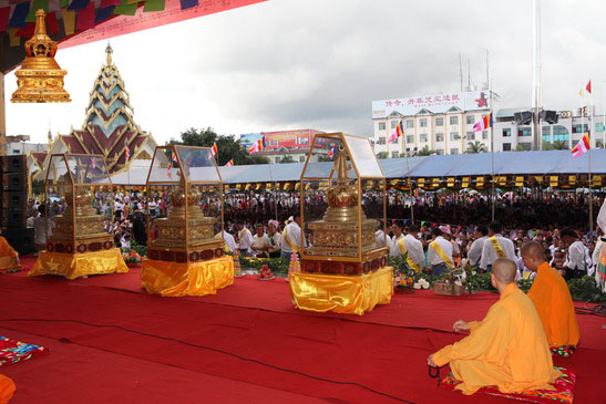 2013年6月6日上午,应云南省佛教协会、德宏州瑞丽佛教协会及广大云南信众强烈要求,北京灵光寺和云南德宏州上座部僧侣一起在瑞丽姐告国际广场隆重举办“中国佛牙舍利塔(等身)供奉大法会”,恭送即将赴缅供奉的由中国佛教协会北京灵光寺按照1:1比例敬造的鎏金佛牙舍利塔,以满足云南信众对佛牙舍利的虔诚信仰和恭敬之信心。此次法会有近二百名南北传僧侣共同参与,北京灵光寺方丈常藏大和尚亲自主法;中佛协张琳副秘书长率佛协相关领导随喜出席法会。近万信众虔诚朝拜,场面隆重而庄严。 此次法会经国家宗教局批准,由北京灵光寺主办,是灵光寺对缅系列友好、慈善活动之一。多年来,灵光寺与缅甸人民结下殊胜缘份,灵光寺佛牙舍利历史上曾四次出访缅甸(1955、1994、1996、2011年);灵光寺一直为促进中缅传统法谊、加深两国之间胞波情谊默默耕耘。 6月7日将与缅方共同举行盛大交接仪式。届时,国家宗教局、云南省委、中国佛教协会重要领导将亲自出席,与缅甸政府和宗教局共襄佛牙舍利赴缅供奉之盛举。
