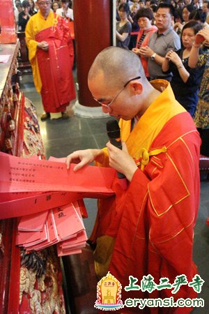上海奉贤佛教协会会长、本寺住持智能法师在祈福法会上为每位高考的家长遍洒甘露净水,希望这样的加持能传递给她们的子女,祈愿所有的学子能在佛力加持下:沉着冷静、思路清晰、运算细致、答题规范、超常发挥,考出优异的成绩!