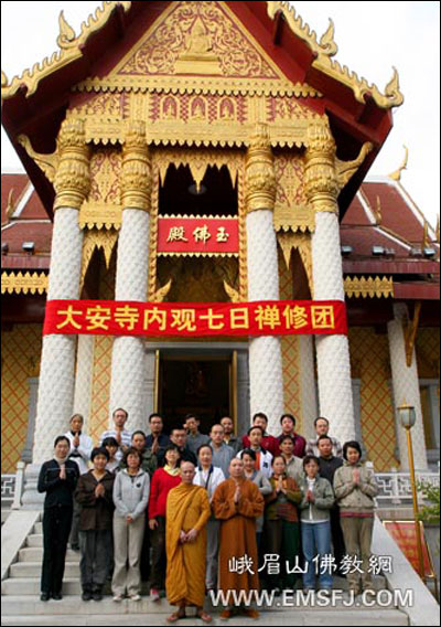 2009年10月1日至7日,正值新中国60华诞和中秋佳节之际,北方峨眉大安寺举行“内观七日禅”禅修活动,参与者近30人。他们当中大多是来自北京、天津地区的法师和信众。活动中,他们严格坚持禅修制度,一切活动如法如律,把行禅、坐禅、悟禅有机结合,融会贯通,以达到静心修身、开悟明智的目的。参与者普遍反映:这次禅修活动使紧张的身体得到了调理、杂乱的心灵得到了净化、善行的根性得到了固化。总的感觉:非常有意义,办得很成功。
