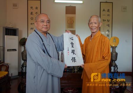 果东法师向道元法师赠送圣严法师的书法作品