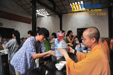 中午11时30分,一百名学员代表有序地排着长队、手捧着即将供养给文殊院各位法师的供养,怀着无比恭敬、感恩的心,一步一步轻轻地来到五观堂外静静等候。11时40分,文殊院方丈宗性法师与一百位法师在观堂内慈悲应供,学员们恭敬问讯后,将凝聚着无尽恩情的心意供养到每位法师手中,法师们合十礼谢,感恩居士大众。