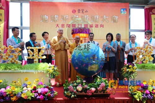 祈福大会于23日上午在灵鹫山无生道场的华藏海大殿展开,甫出关的心道法师率领闭关精进的信众们恭迎观音出关,并与萧万长、由普陀山佛教协会副会长净旻法师率领迎请团法师们及各界贵宾,把经过百万遍大悲咒祝福的净水洒向地球,希望众人齐心以各宗教最虔诚的礼赞,祝祷地球无灾无难、和谐平安。