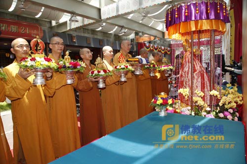 普陀山佛协副会长净旻法师率法师迎请团向灵鹫山观音献花