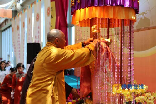 心道法师向即将跨海安奉普陀山的灵鹫山观音献衣(披风)