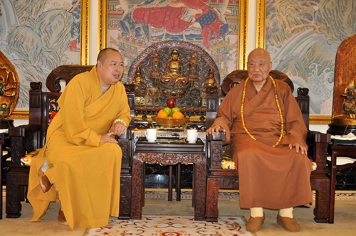 双方交流中,印顺大和尚首先介绍了弘法寺的开山祖师本焕长老圆寂前后的情况,弘法寺近些年的建设发展、弘法寺弘扬传统文化以及开展对外友好交流的情况。年过八旬的性空长老向印顺大和尚介绍了加拿大佛教会从1968年创立至今的发展并籍此传播中华传统文化、佛教文化的情况。性空长老强调说,“中国佛教四大名山代表着中国佛教的精神,是中国佛教文化的生动写照,是弘扬中华文化的名片,加拿大佛教四大名山的建设将成为北美佛教发展史上的里程碑;希望今后与弘法寺加强交往与合作,共同为推动中华文化在世界范围内的传播做出更大的贡献。”印顺大和尚诚恳地赞扬了加拿大佛教会所做的努力和贡献,并表示弘法寺对于建设道场和弘扬中华文化视为本分,愿向前辈学习,以此交流为契机,相互探讨经验,加深中加两国佛教友好交往,促进中国佛教在海外的弘法和交流。