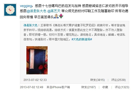 今天中午,新浪微博用户“谁是张大色”发出微博:“王菲敬书《佛说长寿灭罪护诸童子陀罗尼经》线装印本,每本皆由她亲手钤印,现结缘流通。结缘方式:慎重发愿此生之中不再堕胎,亦不劝人堕胎者,即可获赠一册。初印六百册,赠完则止。请将姓名,具体地址,邮编,电话私信告知,快递到付,限中国大陆地区。”并配上了王菲亲手钤印经书的图片。