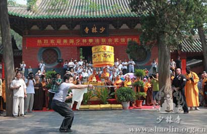 在少林寺山门前,美国少林拳法联合武馆的学员们展示了少林拳、六合对练等经典的功夫招式,赢得少林僧人及中外游客的阵阵掌声。随后,少林寺武僧带来的正统少林功夫,则让外国的功夫迷们赞不绝口。“他们的动作和身体的协调能力真让人惊叹,看了他们的功夫演练,我觉得自己的修行还远远不够”,一位学员如是说。