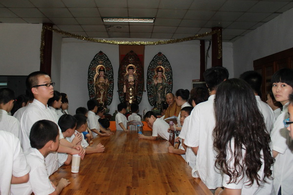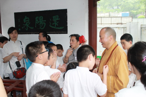 在夏令营老师的礼请下,理海法师随缘介绍了清凉文化和清凉寺的历史、现状以及与地藏王菩萨的因缘,然后由国学老师给孩子们讲“孝悌之道”。课间天降甘霖,孩子们欢喜地在三圣殿和还阳泉聆听了更多典故,得到了法师更多的祝福。