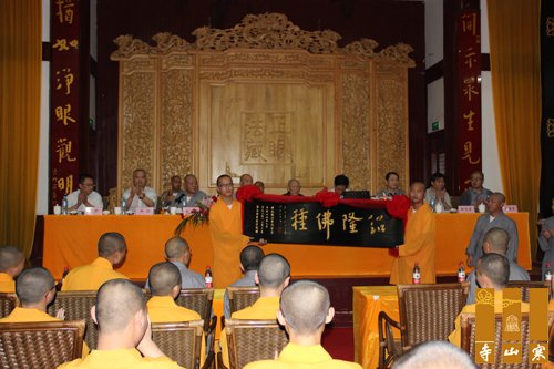 随后,与会领导、嘉宾为在场毕业学僧颁发了毕业证书。寒山书院的毕业生还向母校赠送了匾额以示感谢。典礼结束后,与会领导、嘉宾与书院的全体师生在法堂前合影留念