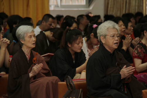 18日上午,弘法寺经堂内依旧如法如律举行华严法会,持诵完毕,华严放生法会于中午时分在弘法寺斋堂前举行。