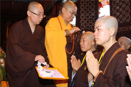 7月16日,早斋后下起大雨,学员们穿着整齐的搭衣,冒着大雨大声高声念诵释迦摩尼佛的圣号进入大雄宝殿。此时雨下得越来越大,衍天法师说:“谁也不要打伞,我们就在雨中进行迎请三师!”近两百人的迎请队伍在大雨滂沱中进行。在随后的剃度仪式中,随着衍天法师口念诵着:金刀剃去娘生发……誓断一切恶,誓度一切众生……所有的学员都流下来热泪。