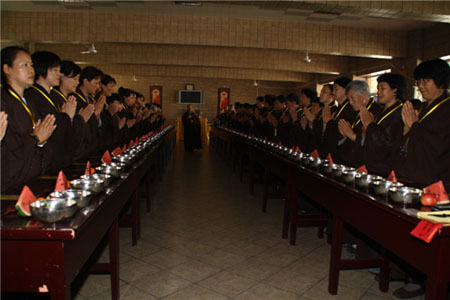 15日早斋后,由引礼师对学员进行分班并培训威仪,学员们学的非常认真。中途维那常度师讲解了出家的功德利益及在家的过患,希望大众学员珍惜这次修行的机会。很多学员都留下了苦楚的眼泪,更进一步加深了对佛菩萨救度众生悲心愿力的感恩及我们现实轮回的大苦感受。