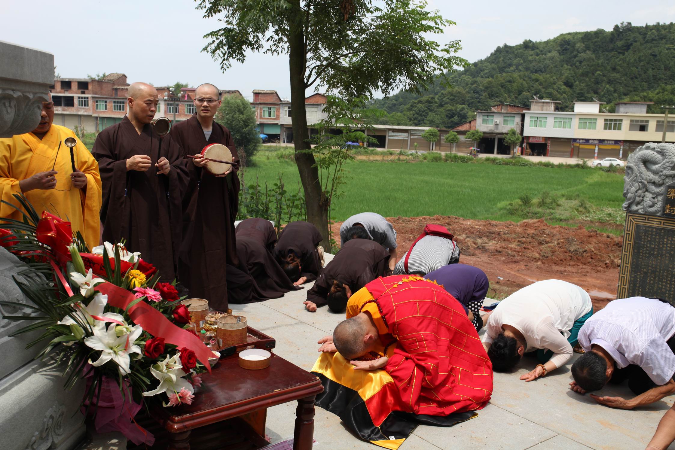 在新落成的慈昱禅师塔前的碑文中记载了重修历代祖师塔的缘起。慈化禅寺于宋景祐间开基于南山,孝宗乾道间,宜阳显迹,泉神施地,普庵禅师移于今址,元元贞间,慈昱禅师更新之,广大兴盛于江表,有东西二十四寮,号“天下第一禅林”,甲申之年妙安住持偶缘由宝峰来此,感祖师先德,谋兴道场,近十年矣,虽大雄宝殿、万佛楼、圆通殿、放生池、东寮房等次第鼎新,然每念及先祖塔墓,除普庵祖师之塔存于普光明殿,余者皆湮没荒山,无从查找,实心不能安。壬辰清明前三日,邓艺居士在梦中得一僧指引寻得慈昱禅师舍利塔所在,妙安住持得知非常高兴,嘱咐要多方探寻寺院先祖塔墓所在,一年来,收获颇丰,于首印山、大布上、三塔里、福善庵、登南桥、天龙岩等地寻得大小塔墓二十余处,有名讳可考者十余处。蒙天津金淑花、金龙峰、广东陈锦创、南昌张朝晖、吉安肖冬梅等诸居士施资,于今年清明动工重造九塔七墓,造塔树碑,重修坟塔。