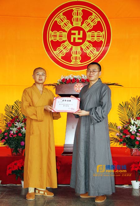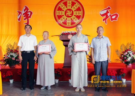 山西省佛协副会长法海法师为一等奖获得者天龙寺心如法师颁奖