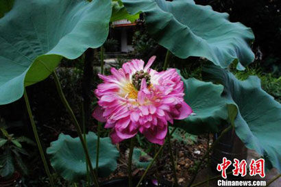 极为罕见的紫红色千叶宝莲,盛夏时节,悄然在禅宗祖庭广东南华寺无尽庵中绽放,令偶尔得以一睹芳容的香客和游人啧啧称奇。记者26日在无尽庵主殿前的花圃中见到,两株高约一米的莲花分别生长在两口直径约60厘米的水缸里。右边的水缸中,一朵紫红色的千叶宝莲盛开在茂盛莲叶中。