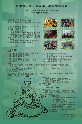 成都文殊院兹定于2013年秋季开办第五期闻熏班,文殊院青年佛学会开设有次第、系统的佛法学修班,以期大众同沐法雨,共创幸福和谐人生。