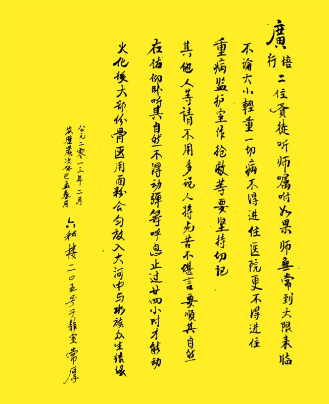 广行广培二位贤徒听师嘱咐,如果师无常到大限来临,不论大小轻重,一切病不得进住医院更不得进住重病监护室作抢救等,要坚持切记,其他人等请不用多说,人将死苦不堪言,要顺其自然,左右仰卧听其自然,不得动弹等,呼息止过二十四小时才能动,火化后大部分骨灰用面粉会匀放入大河中与水族众生结缘。