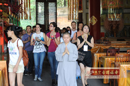 2013年8月1日,酷暑时节气温高达40度,湖南长沙开福寺迎来了耶鲁和哈佛大学禅修夏令营的26名外国学生。