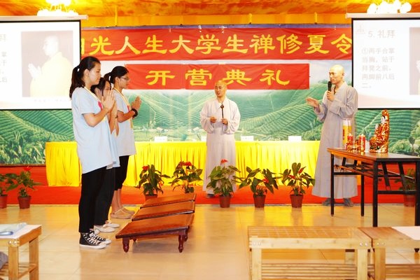 8月8日下午两点,晴空万里,彩旗飘扬,在一派祥和庄严的氛围下,全体学员相聚般若楼,“阳光人生”大学生禅修夏令营在“相见欢”的迎新主题下拉开了序幕。本次活动由妙宣师兄主持,首先介绍了学员的分组情况,并确认了每队的队长。