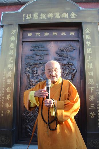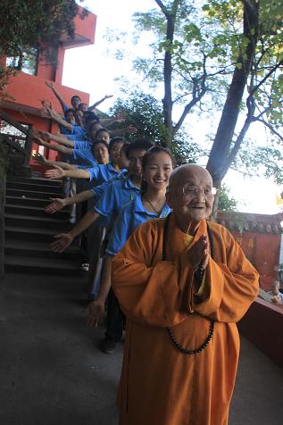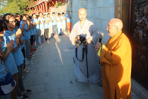 烈日渐渐升起,在行走了两个多小时之后,大家终于到达了山顶。印空老和尚在山顶守候,并向我们开示,说大家今日的功德是无边无量的,今日种下的因,日后定能修成佛果。在以后的生活中,要清净本心,行愿大千。如此将禅的要义融入生活点滴,而获得幸福的人生。