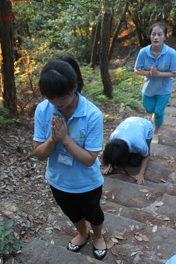 8月8日,经过四天朝四晚九的生活,营员们已经基本适应了寺院里清净的生活。此时,大家又迎来了一次新的改变和挑战——拜山。所谓拜山,即以虔敬的心三步一拜,登上金山寺去朝拜山顶的万佛塔。当年虚云法师也是三步一叩,历尽艰辛,前往五台山朝拜还愿的,所以今日的行脚是效法先贤,虔敬礼佛的大功德。
