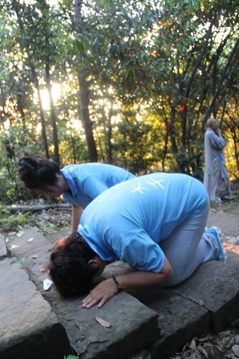 在金山寺的斋堂用斋完毕,9点,大家开始朝拜万佛塔。朝拜并不是迷信,而对佛的虔敬与感恩。诸相无常,人生本苦,是佛陀以他的大智慧教授我们以解脱之道,因而要像师长一般对佛陀充满感激和敬畏,而朝拜万佛正是此心。