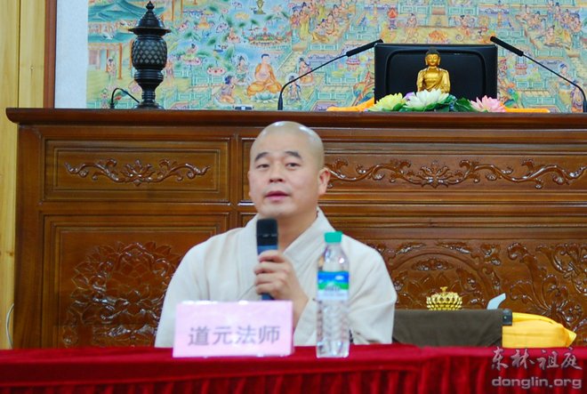 在热烈的掌声中,东林寺监院道元法师为青年营员们作了精彩的开示。道元法师代表东林寺对同学们的到来表示热烈地欢迎并介绍了祖庭的净土文化。1600多年前,东晋慧远大师缔结白莲社,集123人精修念佛三昧,大多有定中见佛的体验。史料记载,远公禅定中三次见佛。慧远大师被尊为净土宗初祖。 东林寺也就是净土宗初祖祖庭所在。